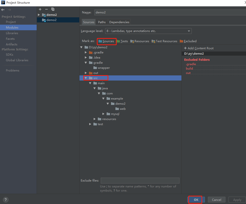 注意,如果demoo2项目文件夹为普通文件,无法新建package,需要点击如下图标,将src标注为Source
