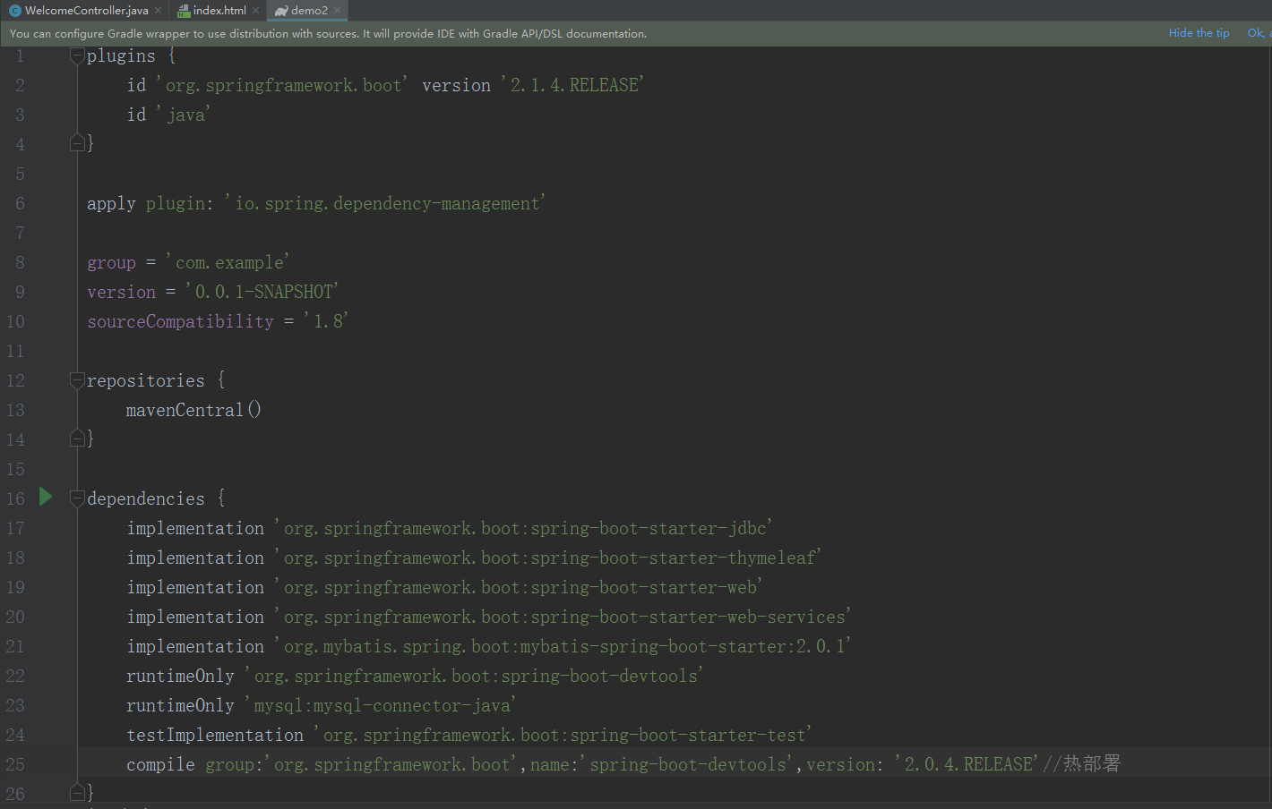 compile group:'org.springframework.boot',name:'spring-boot-devtools',version: '2.0.4.RELEASE'//热部署