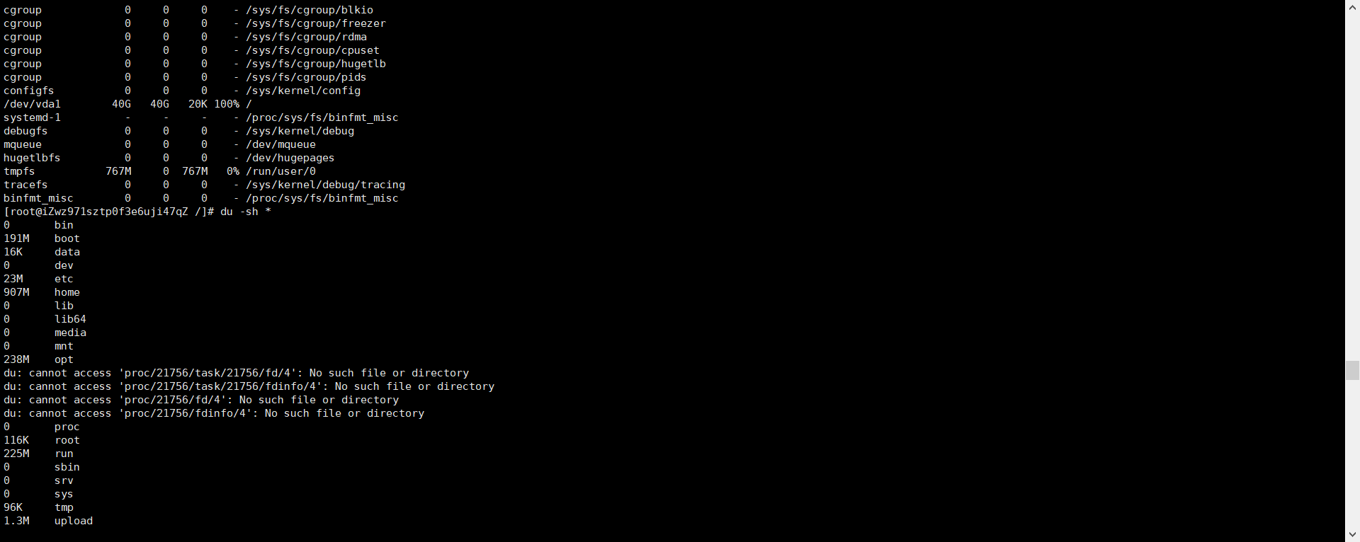 今天阿里云的一台centos8服务器的出现了显示磁盘占满,但实际磁盘未占满的问题,截了一些相关的图片