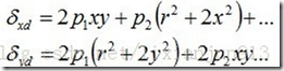 薄棱镜畸变是由镜头设计和制造缺陷等误差造成(比如镜头与摄像机像面之间有很小的倾角,其不仅会引起径向偏差,而且会引起切向误差)其数学模型为: