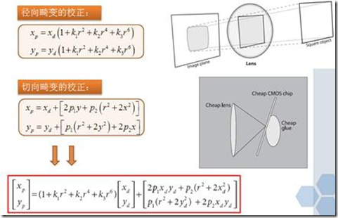 主要包括离心畸变和薄棱镜畸变,其中,离心畸变是由摄像机的镜头中各个透镜的光轴不能完全重合造成的。
