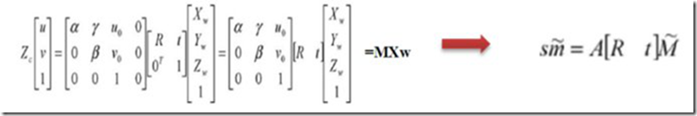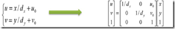 其中,很容易可以知道alph=f/dx,beta=f/dy,分别代表了以X轴与Y轴方向上的像素为单位表示的等效焦距。gamma在较高精度的相机模型中引入,表示图像平面中以像素为单位的坐标轴倾斜程度的量度,gamma=alpha*tan(theta),theta是相机CCD阵列v轴的偏斜角度。
