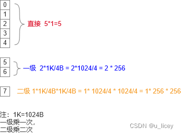 某文件系统采用索引节点管理,其磁盘索引块和磁盘数据块大小均为 1KB 字节且每个文件索引节点有 8 个地址项 iaddr[0]~iaddr[7],每个地址项大小为 4 字节,其中 iaddr[0]~iaddr[4]采用直接地址索引,iaddr[5]和 iaddr[6]采用一级 间接地址索引,iaddr[7] 采用二级间接地址索引。若用户要访问文件 userA 中 逻辑块号为 4 和 5 的信息,则系统应分别采用(25 ), 该文件系统可表示的单 个文件最大长度是( 26)KB。