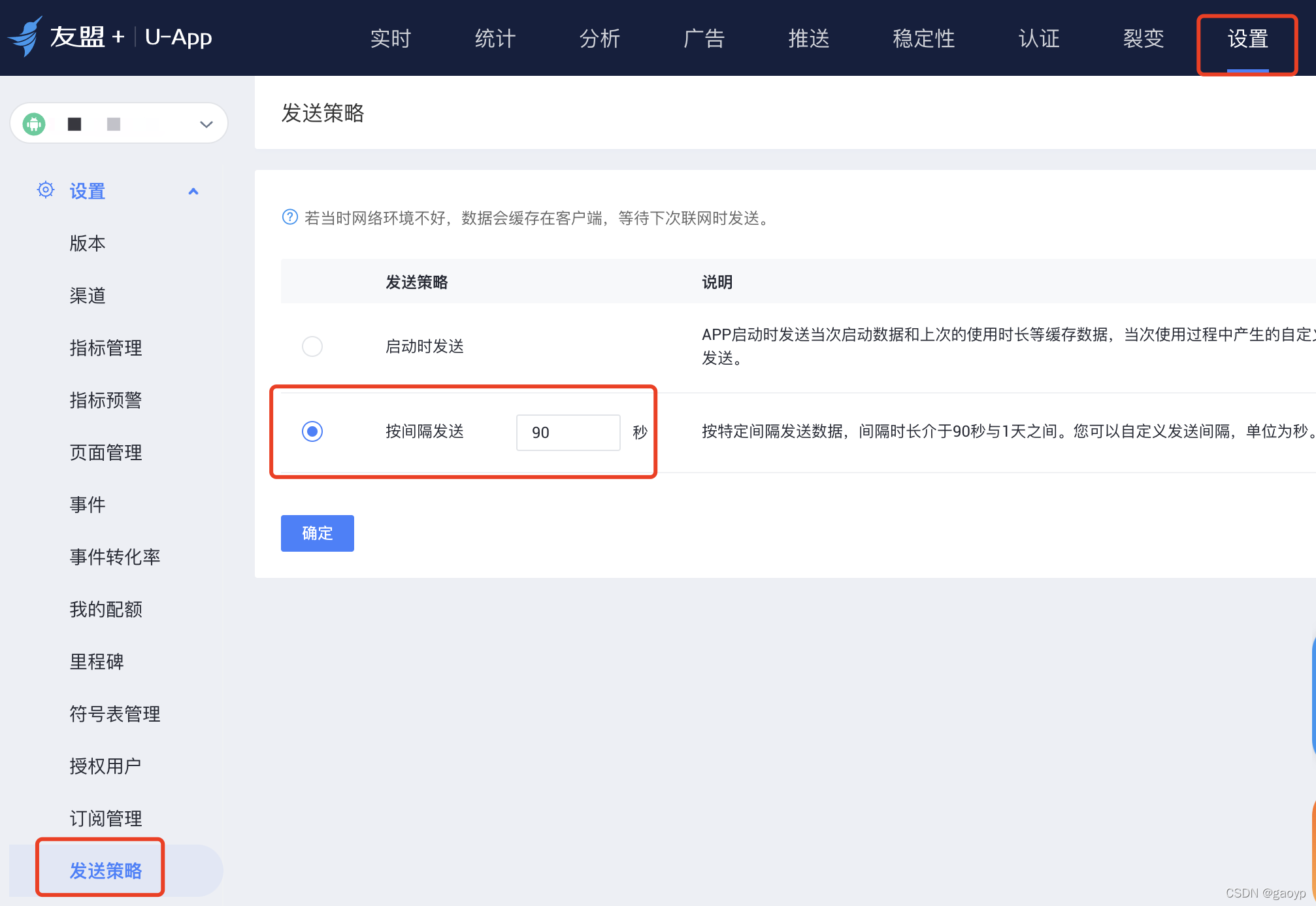 三、事件只要从App上报到了服务端,就会实时显示,事件的上报间隔是在友盟的管理平台上设置的。建议在集成阶段,将上报间隔设置成最小的90秒,以便快速查看埋点是否正确。