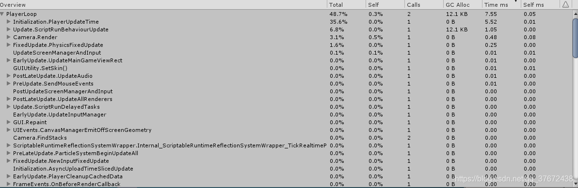 | Self | 在一个特定函数上花费的总时间百分比,不包括Unity调用子函数的时间。 例如,在截图中,41.7%的时间花在了相机渲染功能上。这是因为它调用了大量的绘图和筛选函数,但是当您排除它调用的函数时,只有3.5%的时间花在相机上。渲染函数本身。 |