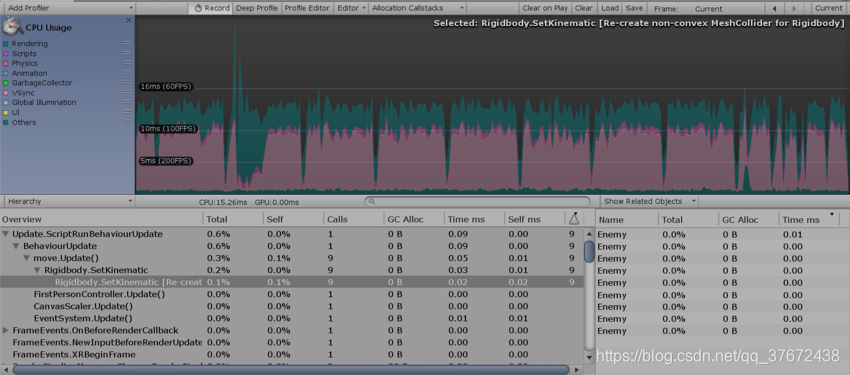 Show Related Objects :视图显示UnityEngine与profiler样本关联的对象,使用UnityEngine.Object的Begin()重载获取对象物体. 一些Unity报告的样本已经内置了这些关联, 就像 Camera.Render 关联的是Camera 物体g. 这些对象通过它们的instance ID进行报告,并在Profiler窗口中解析为一个名称。
