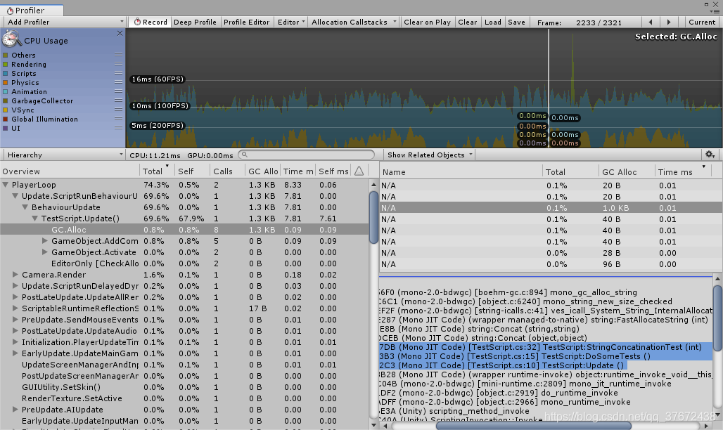 如果Editor下分析, 你可以看到完整的GC.Alloc的调用堆栈.打开 Managed Allocations .GC.Alloc 样本中会包含他们的调用堆栈