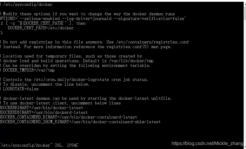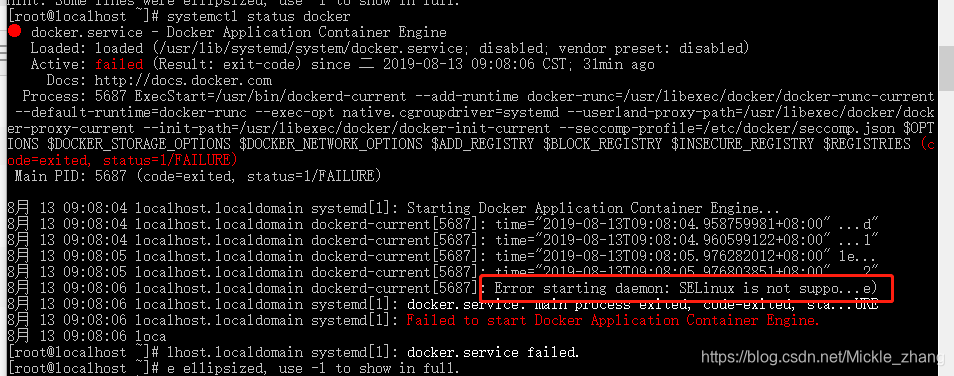 3. 其中标记红框的告诉我们:此linux的内核中的SELinux不支持 overlay2 graph driver,解决方法有两个,要么启动一个新内核,要么就在docker里禁用selinux,设置--selinux-enabled=false。我们采用第二种方式。编辑文件:/etc/sysconfig/docker