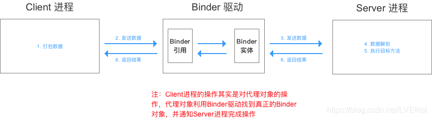 可以看见,两个进程直接与内核空间通信,而数据的拷贝和发送都是通过Binder驱动来完成。这样就实现了两个进程之间间接实现了通信功能。