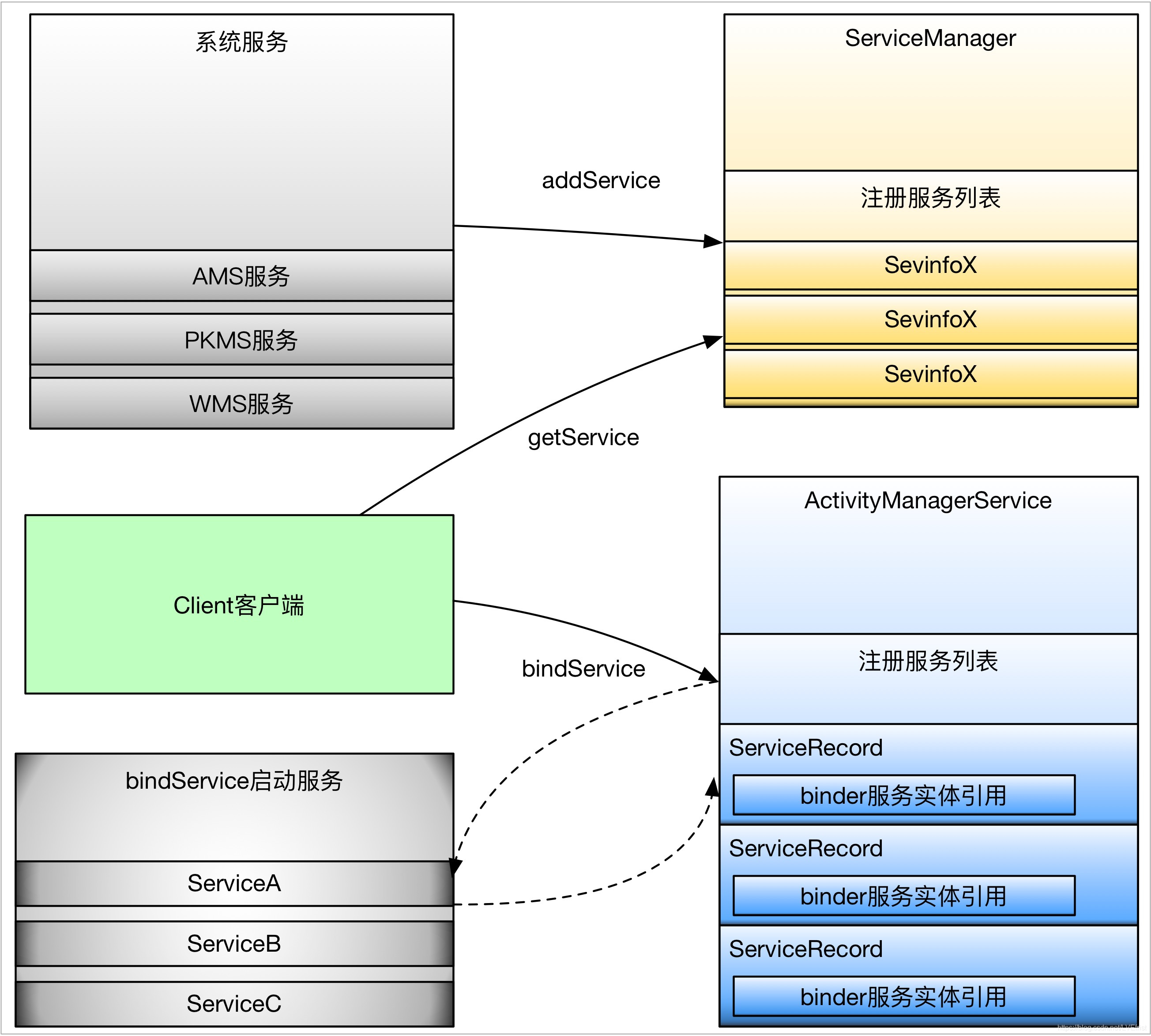 首先看一下服务的启动上,系统服务一般都是SystemServer进程负责启动,比如AMS,WMS,PKMS,电源管理等,这些服务本身其实实现了Binder接口,作为Binder实体注册到ServiceManager中,被ServiceManager管理,而SystemServer进程里面会启动一些Binder线程,主要用于监听Client的请求,并分发给响应的服务实体类,可以看出,这些系统服务是位于SystemServer进程中(有例外,比如Media服务)。在来看一下bindService类型的服务,这类服务一般是通过Activity的startService或者其他context的startService启动的,这里的Service组件只是个封装,主要的是里面Binder服务实体类,这个启动过程不是ServcieManager管理的,而是通过ActivityManagerService进行管理的,同Activity管理类似。