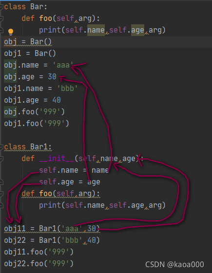 obj = Bar('aaa',30,'999')是先执行Bar(),生成obj对象,然后python调用obj的构造方法,而 Bar('aaa',30,'999')括号中的参数,就是传给构造方法的参数。