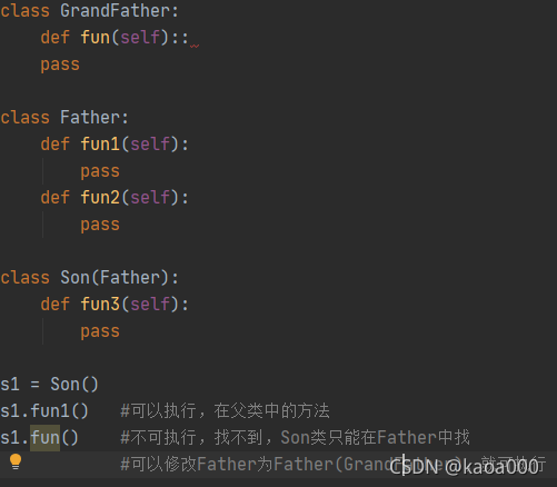 在定义类的时候,类名后加上括号,括号中写上父类名。上例Son是子类(或叫派生类),Father是父类(或叫基类)