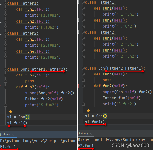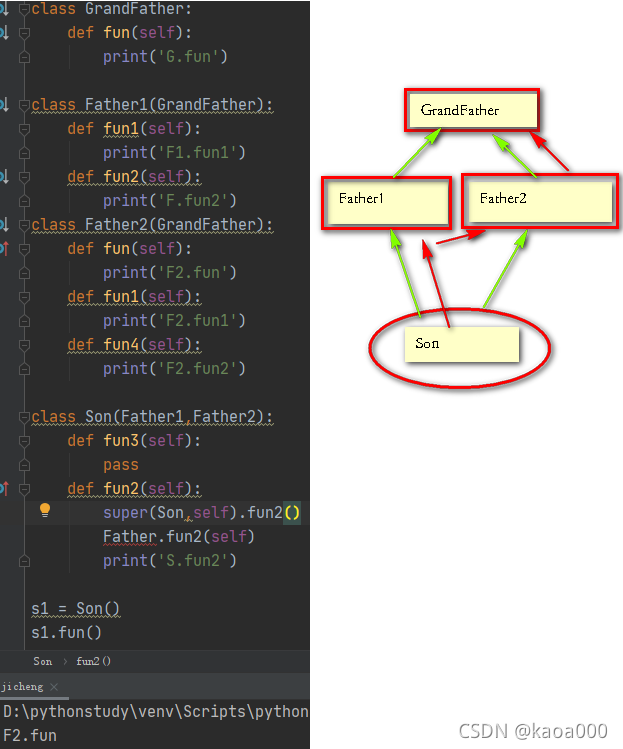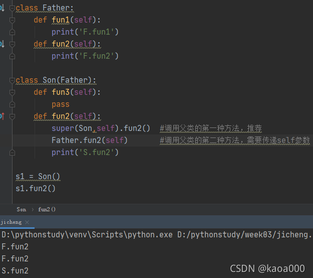 对于Son中的fun2,如果即想执行本类中的方法,又想执行父类中fun2方法,需要使用super()方法: