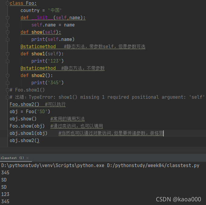 - 静态方法,保存在类中,在方法上加上装饰器@staticmethod,下面定义的方法就是静态方法,静态方法的参数是可选的,即可以没有self参数,可以通过类直接调用。