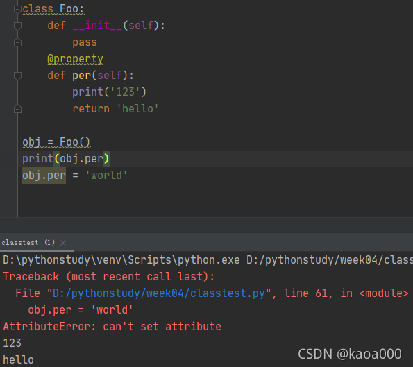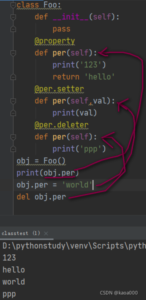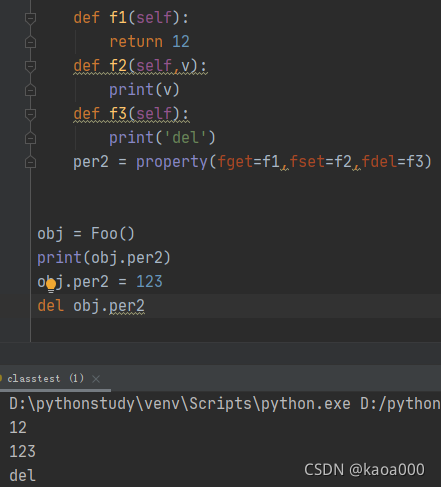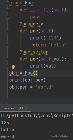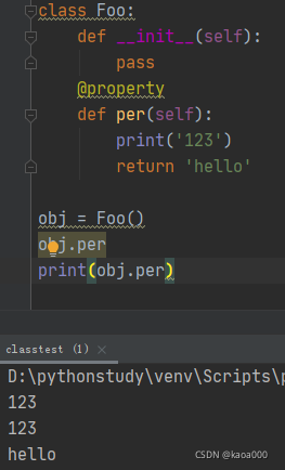 对于per,它的定义与方法相同,但是它的调用与字段相同,就是使用对象.方法名,后面没有括号,这种使用@property装饰器修饰的方法,这叫做属性。