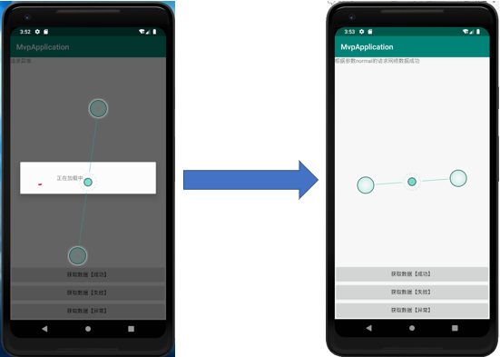 因为是模拟网络数据请求,所以有三个请求数据的按钮分别对应成功、失败、异常三种不同的反馈状态。