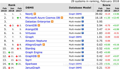 知识图谱是基于图的数据结构,通常用图数据库进行存储,我们先来看一下图数据库排行(部分)。数据来源DB-Engines Ranking(https: //db-engines.com /en/ranking /graph+dbms)。