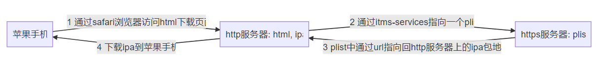 通过itms-services协议,在safari浏览器可以直接在iOS设备上安装应用程序。itms-services协议需要一个plist配置文件,这个plist文件必须放在https服务器上,通过plist中的配置,再指向回http服务器中的ipa地址。