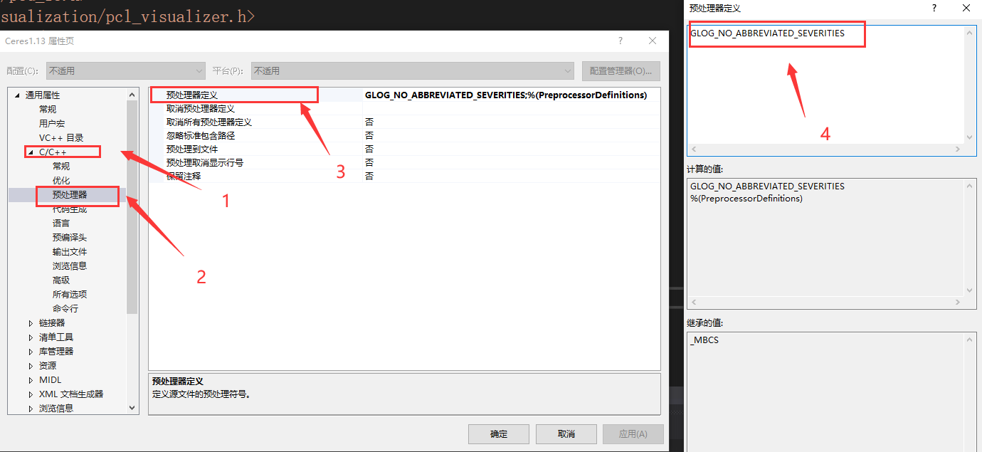 项目属性-Ceres属性表-C/C+±预编译器-预编译器定义:添加GLOG_NO_ABBREVIATED_SEVERITIES,如下图