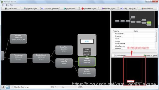 从下图中看到模拟器此 activity 的画面布局信息,左边部分是hierarchy通过树形结构展示的布局形式,右下角是模拟器上当前页面的 UI 布局信息。