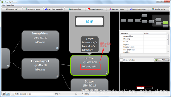 通过滚动鼠标,可以放大每个树节点。拖拽鼠标,移动树形结构布局。双击树节点可以展示单独的 UI 部分。从下图中,可以看到,id/btn_login即为登录按钮的 ID 。依次类推,可以查看其它控件 ID 。