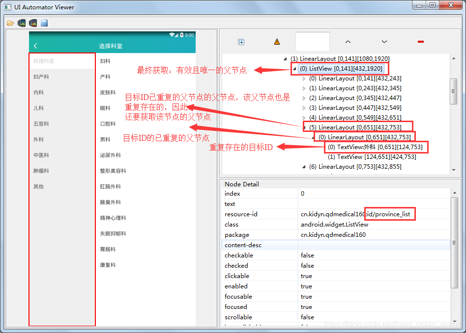 由上图中,uiautomatorviewer每个控件前面的数字即相当于Hierarchyviewer的角标,我们同样可以获取到目标 ID 的最终有效且唯一的父节点,从而调用函数getChildView('id/province_list',5,0,0)