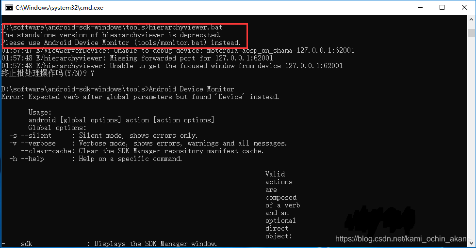 大概意思是说,单独版本的hieararchyviewer已经被弃用了。请使用 Android Device Monitor 来代替。Android Device Monitor 在 tools 目录下面找到monitor.bat即可。