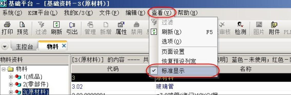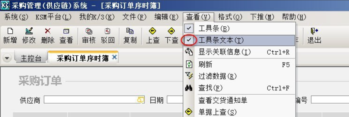 登录到ERP系统中,发现所有序时簿的工具栏中只显示工具图标不显示工具文字说明,登录到主控台也是一样,让操作者不知所措,操作起来十分不方便,查看别的用户客户端一切正常,重装系统问题依旧,排除服务器与网络的问题,可能与客户端系统设置有关,最后发现只要在客户端序时簿界面,查看菜单中勾选"工具条文本"即可解决问题.金蝶k3界面,菜单栏只显示了按钮图标没显示出对应的文字。有两种解决方案:一种是在序时簿的查看菜单中勾选"工具条文本"即可,另一种是在物料操作界面查看菜单中勾选"标准显示"即可.