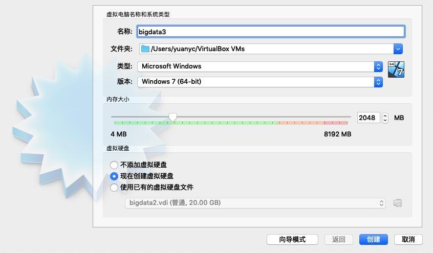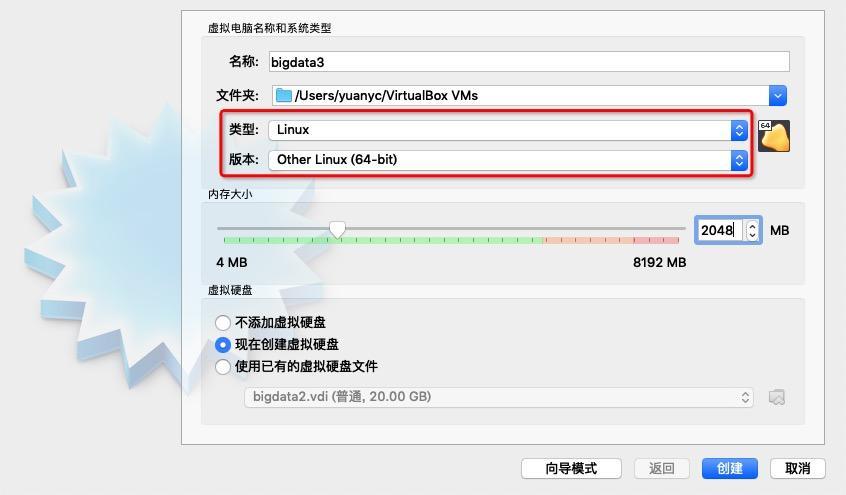 选择新建虚拟机,高级模式设置内存大小(2G推荐)和存储磁盘大小(20G/256G推荐)。