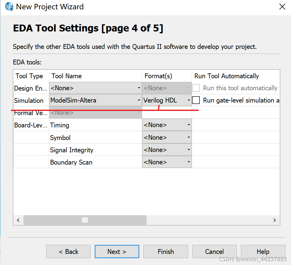在此选项选择仿真需要使用的软件modelsim-altera以及testbench所使用的语言。