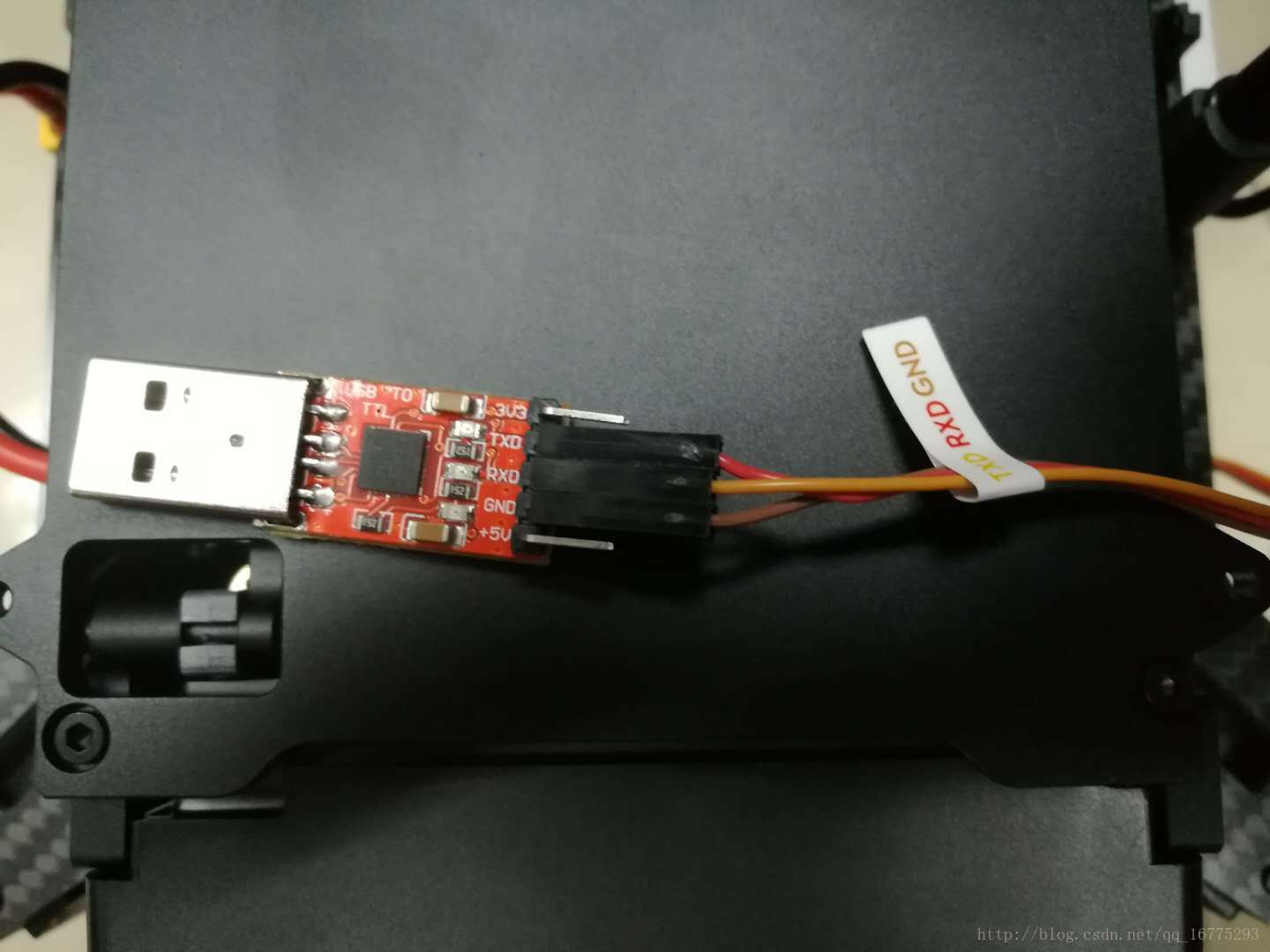 4)记得我们用的是USB转串口模块,从飞机机身 UART_CAN2接口都的数据,使用的是官方送的三根的数据线,RT,TX记得对调,而不是使用USB线直接从飞机机身连接到电脑