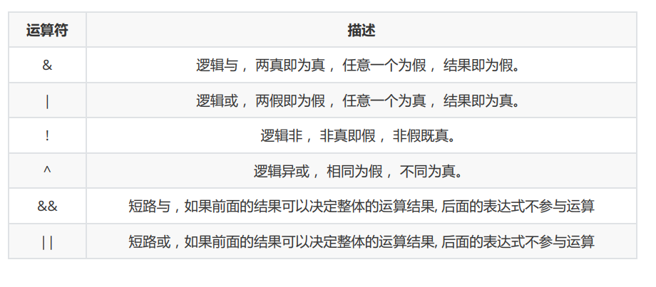 &&(短路与) ||(短路或) !(非) &(逻辑与) |(逻辑或)