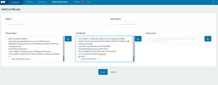 3:(不知道这一步是不是起作用,还是上一步起作用了,反正我都配置了)运行了脚本之后,点击rancher ui中的infrastructure菜单下的certifcate按钮,分别在前两个里面输入了生成的值,如下图所示