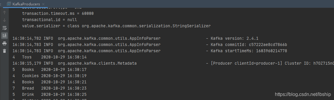 4.在IDEA运行KafkaProducer,可以看到每隔2秒产生一个消费