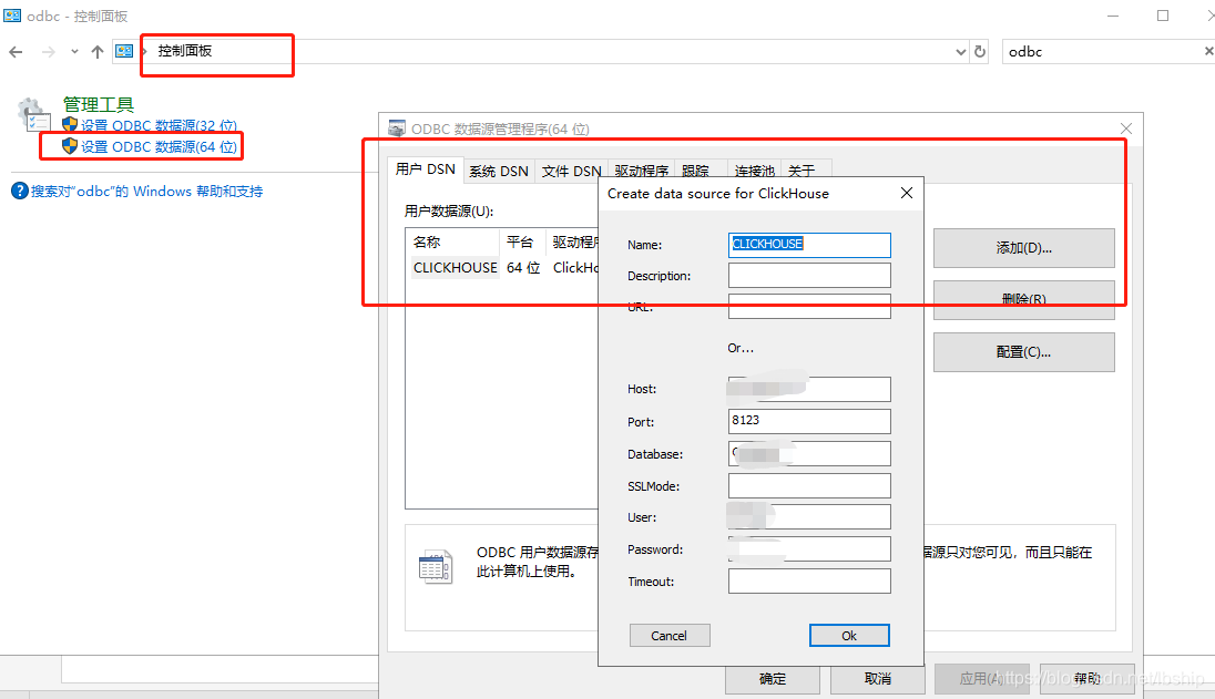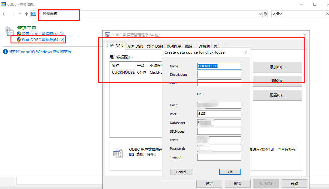 首先安装好clickhouse的ODBC驱动,我安装的是clickhouse-odbc-1.1.7-win64.msi,然后在控制面板设置好ODBC的连接,如图