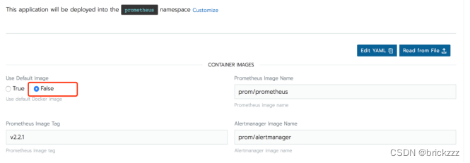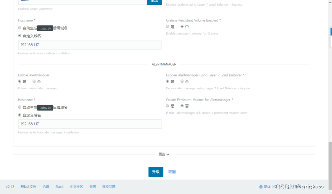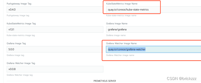 因为KubeStateMetrics和grafana-watcher这两个组件的image是从国外镜像仓库拉取国内环境下载不了所以需要我们提前将镜像pull好,然后在通过下面命令修改镜像地址。这里为了方便将pv和pvc创建都false了,生产环境部署需要将prometheus和grafana的监控数据持久化到pv核pvc上这样更可靠。