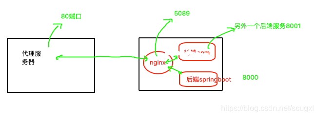 由于有严格的端口限制(对外暴露80端口) 所以我们在右边的服务器才有一个nginx来根据api path做反向代理.