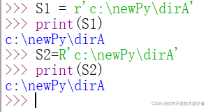 \n被显示为了换行,这并不是我们想要的,如希望得到c:\newPy\dirA,怎么办呢?字符串前加 r,将前面的代码改为