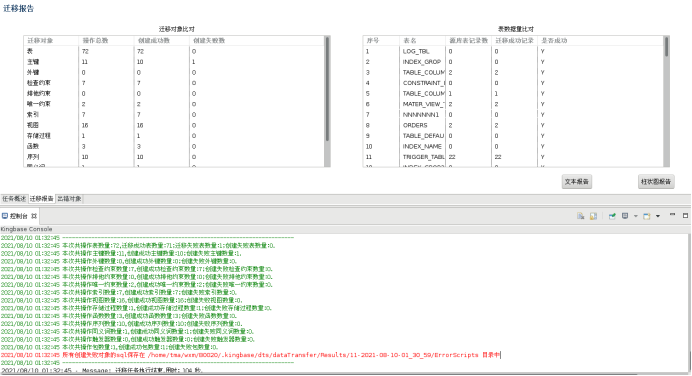 - 文件中包含创建表的sql、迁移过程、创建主键sql和所有非表对象创建的sql语句;还包括迁移异常信息