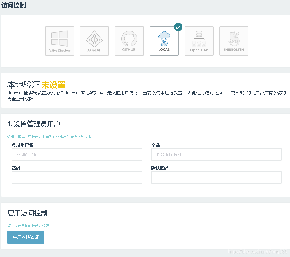 1)安全可以给Rancher配置登录账号(选择 系统管理 --》访问控制 --》LOCAL)
