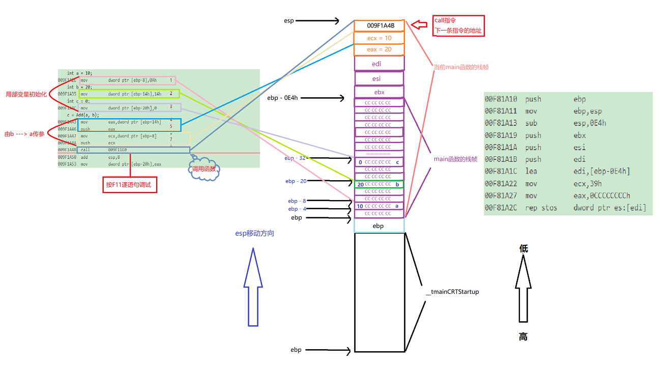 图示中,esp和ebp维护的是main函数的函数栈帧,但是当调用另一个函数时,esp和ebp就需要维护调用函数的函数栈帧。