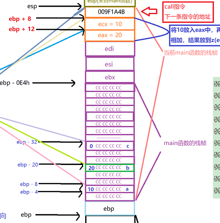 下个元素,下两个元素为局部变量a,b传参时开辟的空间,esp + 8跳过两个单位,这时栈顶指针esp位于寄存器ebi处。 - mov dword ptr [ebp-20h],eax:将寄存器