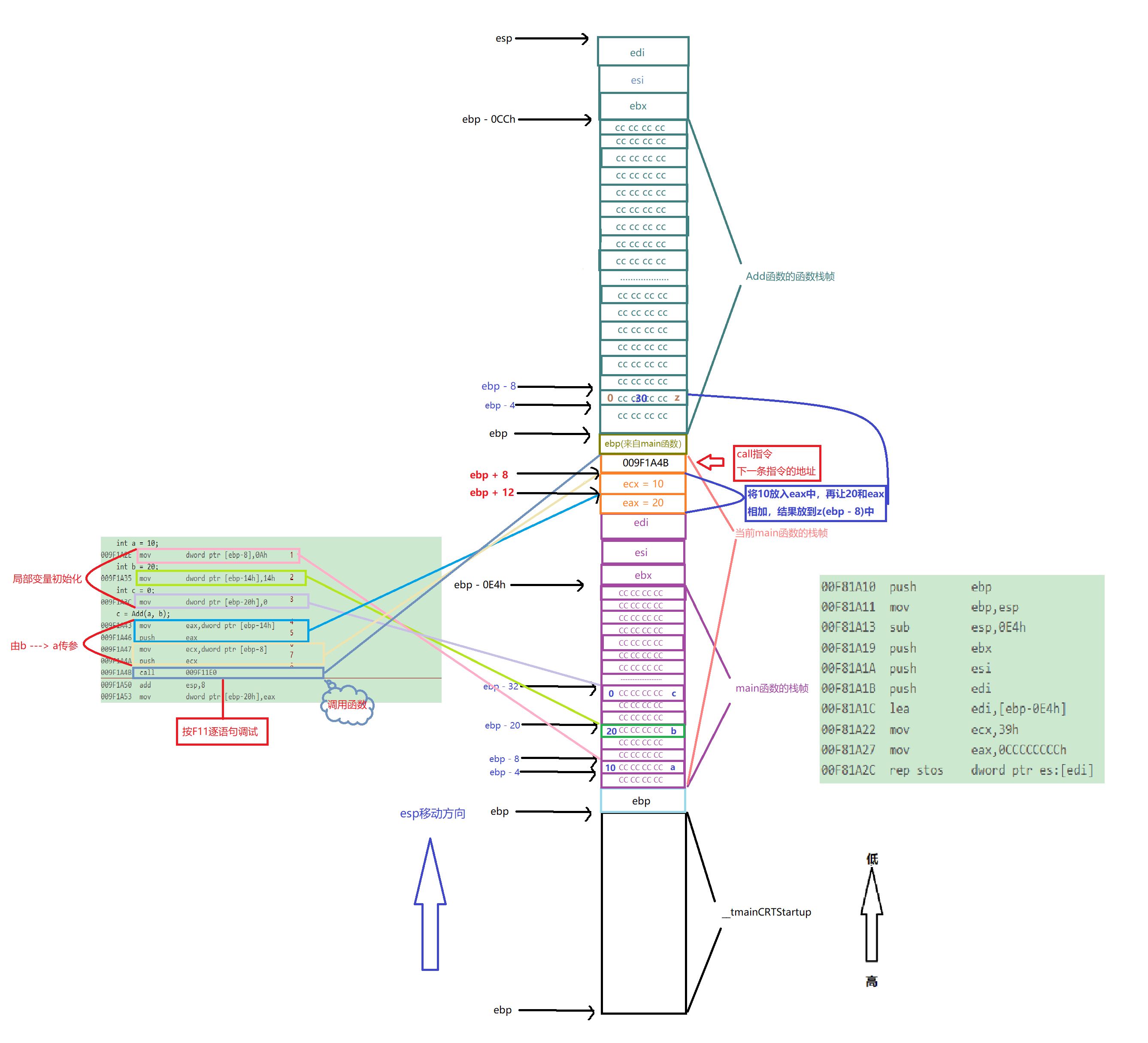 - mov esp,ebp:把ebp指向esp,也就是将Add的栈顶指针