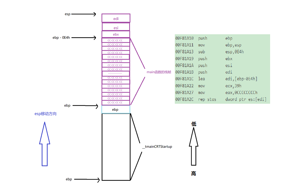 - sub esp,0CCh:将esp中的值减0CCh。esp的位置上移,这时就产生了