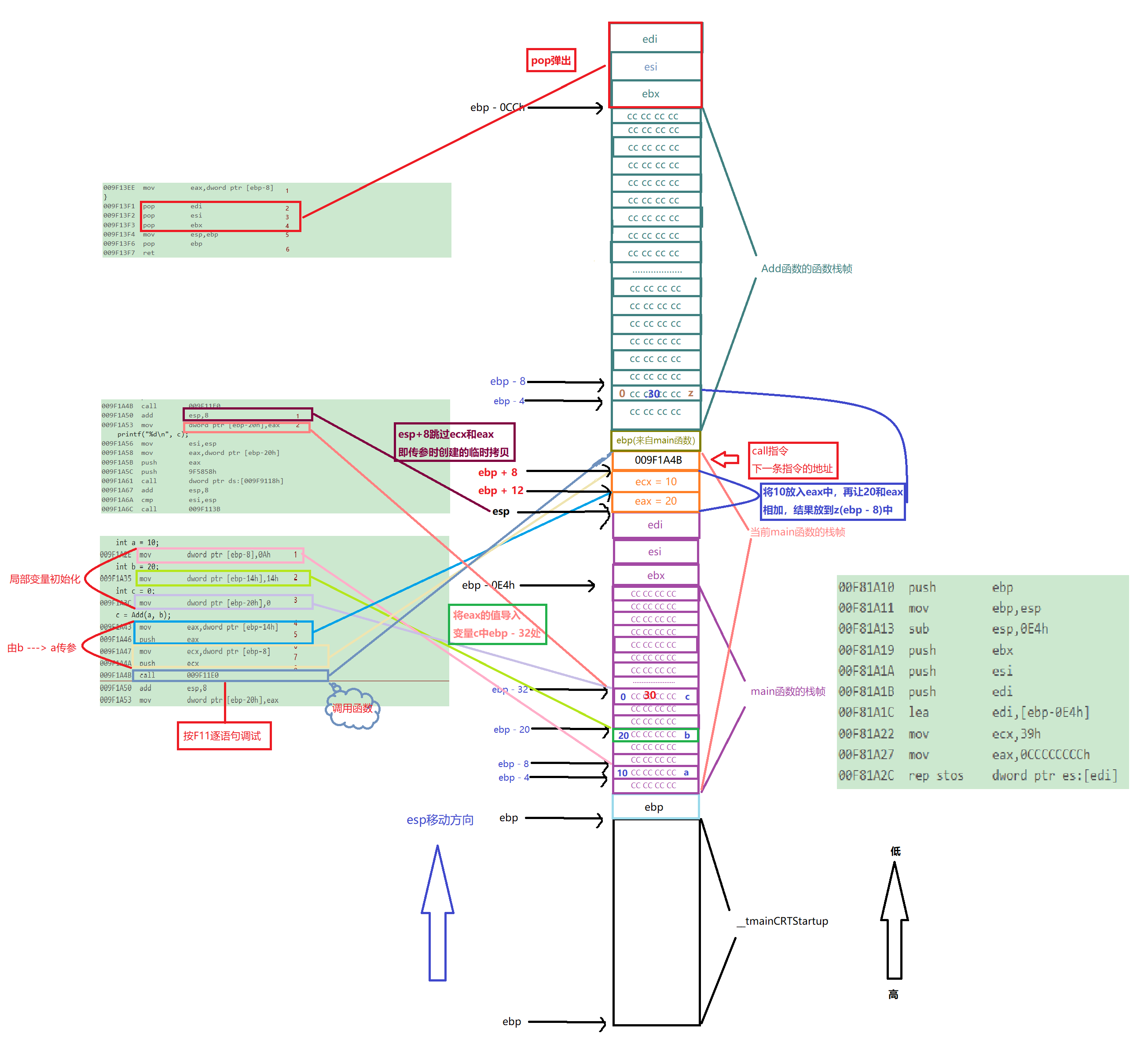 esp,移向Add函数的栈底指针处。 - pop ebp:出栈,把ebp的数据弹出,也就是将