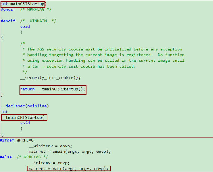 而__tmainCRTStartup()和mainCRTStartup()这两个函数又是什么?在crtexe.c文件中观察: