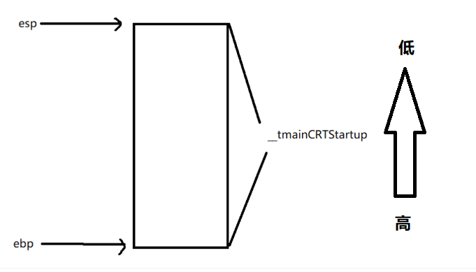 首先,由于main函数是被__tmainCRTStartup()所调用的,所以一开始栈区为: