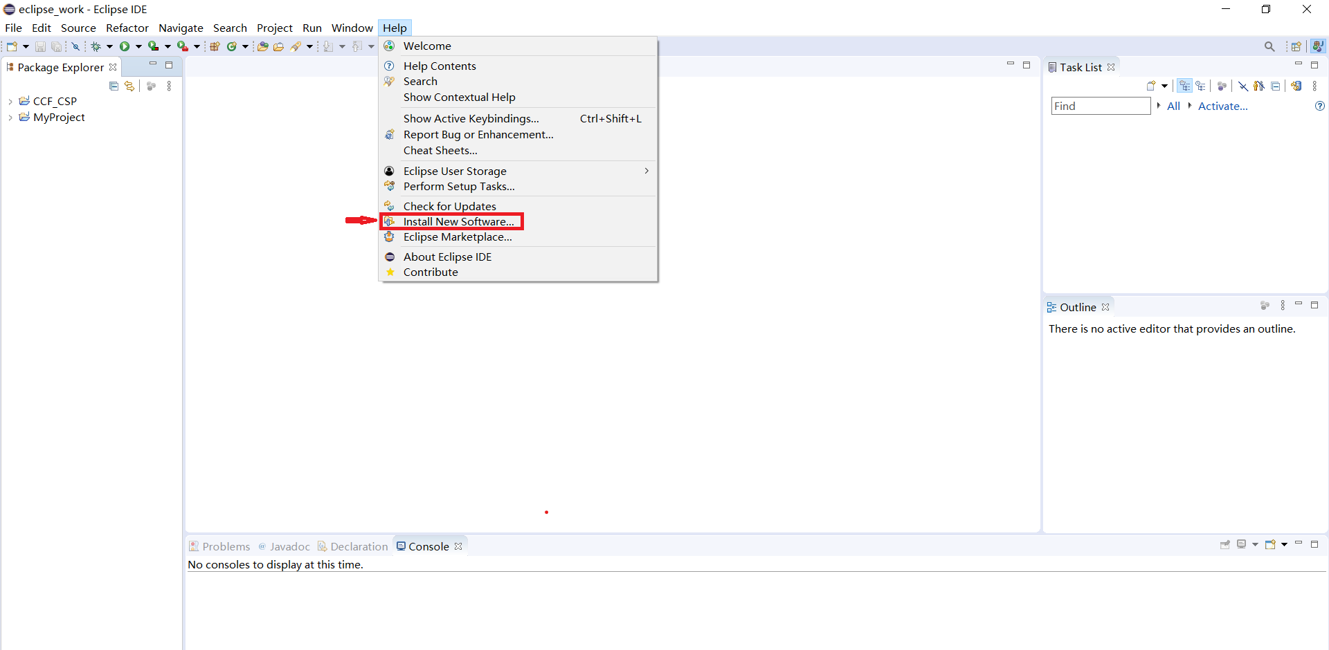 3、打开eclipse,在help选项中找到install new software,点击打开