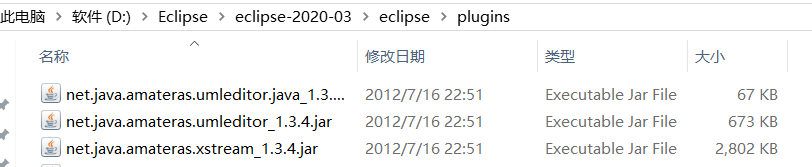 安装AmaterasUML相对来说简单很多。直接将下载的AmaterasUML_1.3.4.zip文件解压后得到的3个jar包拷贝到eclipse/plugins文件夹中就可以了(读者的路径可能与笔者的不同)